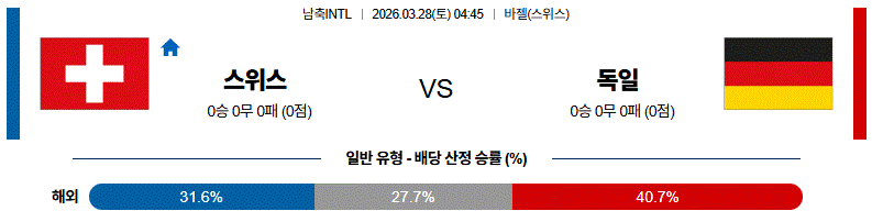 스위스는 안정적인 수비 조직력과 역습을 통해 변수 창출이 가능한 팀이며, 독일은 점유율과 공격 전개에서 우위를 바탕으로 경기를 주도할 수 있는 전력을 갖추고 있습니다.