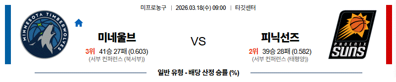 다음날 홈에서 유타를 만나는 일정을 위해서 힘을 분산해야 하는 미네소타는 직전 경기에서 오클라호마에 패배하며 최근 5경기 1승4패 흐름을 보이고 있지만 줄리어스 랜들이 공격에서 중심 역할을 하고 있고 앤서니 에드워즈도 득점 지원을 이어가고 있다. 직전 경기에서는 턴오버가 22개까지 늘어나며 역전을 허용했지만 홈에서는 22승12패로 안정적인 경기력을 유지하고 있다. 반면, 피닉스는 최근 2연패 흐름 속에서 경기 후반 집중력이 떨어지는 모습이 나타났다. 데빈 부커와 제일런 그린이 공격에서 분전하고 있지만 올 시즌 평균 21.2득점을 기록하던 딜런 브룩스의 결장 공백이 크게 나타나고 있고 원정에서도 최근 흐름이 좋지 않다. 미네소타 팀버울브스 승리가 예상된다.