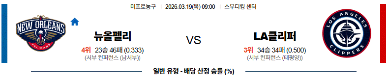 # 홈팀 : 뉴올리언즈(23승46패)