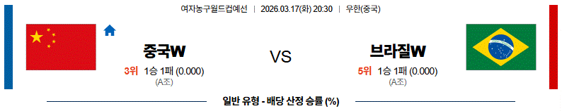 중국 홈에서 펼쳐지는 경기다. 중국 여자대표팀은 직전 체코전에서 84-74 승리를 기록하며 경기 초반 열세 이후 인사이드 전력을 앞세워 흐름을 가져오는 안정적인 경기 운영을 보여줬다. 양수위와 왕쓰위가 공격 전개와 득점에서 중심 역할을 했고 리 위에루와 한쉬, 장쯔위를 앞세운 골밑 높이와 리바운드 경쟁력이 꾸준히 이어지고 있다. 반면, 브라질은 말리를 상대로 76-73 역전승을 거두며 후반 집중력을 보여줬고 다미리스 단타스와 카밀라 카르도주가 골밑에서 존재감을 드러냈다. 다만,수비가 강하다고 볼수 없는 모습 이였다. 중국은 높이를 활용한 인사이드 농구와 수비 리바운드 장악력이 강점으로 나타날 것으로 예상되며 홈 경기라는 점에서도 경기 운영에 도움이 될것이다. 중국 승리가 예상된다.