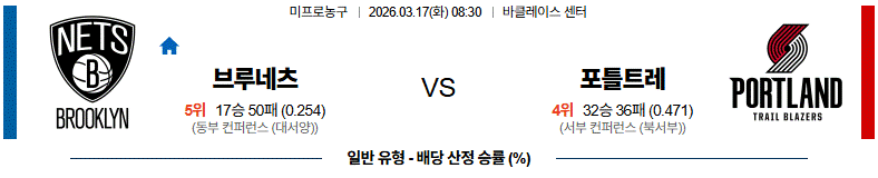 브루클린은 최근 3연패 흐름 속에서 공격 효율 저하와 수비 기복이 동시에 나타나고 있으며 직전 필라델피아전에서도 경기 후반 추격 흐름을 만들었지만 막판 집중력 부족으로 패배를 기록했다. 또한 주요 득점 자원의 부상 공백까지 이어지며 공격 전개 안정감이 떨어지는 모습이다. 반면, 포틀랜드는 최근 경기에서 기복이 있지만 리바운드 경쟁과 수비 압박을 통해 경기 흐름을 만들 수 있는 전력을 유지하고 있다. 두 팀 모두 최근 공격 효율이 높지 않고 턴오버가 늘어나는 흐름이 이어지고 있는 만큼 득점이 크게 올라가기보다는 수비 중심의 경기 양상이 예상된다. 포틀랜드 승리가 예상되며 언더 구간도 매력적인 베팅 구간으로 보인다.