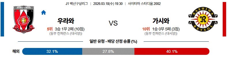 이번 매치는 가시와 레이솔이 현대적인 공격 구조의 완성도로 우라와 수비를 무너뜨리며 승리를 가져갈 그림이 더 자연스럽다.