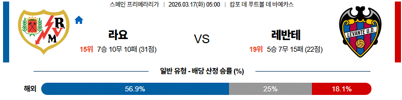 라요는 홈에서 적극적인 전방 압박과 빠른 템포로 경기 주도권을 가져가려 할 가능성이 높고, 레반테는 수비 간격을 유지하면서 역습 기회를 노리는 흐름이 예상됩니다.