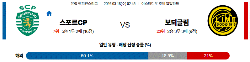 경기 흐름은 스포르팅 CP가 점유율을 가져가며 공격을 시도하고 보되글림트가 역습으로 대응하는 형태가 될 가능성이 있습니다.