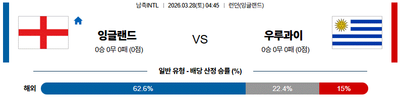 잉글랜드는 공격 자원의 다양성과 빠른 전개를 바탕으로 경기 주도권을 가져갈 수 있는 팀이며, 우루과이는 수비 조직력과 역습을 통해 변수 창출이 가능한 전력을 갖추고 있습니다.