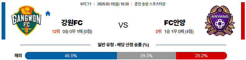 전체적으로는 강원 FC가 점유와 공격 시도를 더 많이 가져갈 수 있지만, FC 안양 역시 쉽게 무너지지 않는 흐름을 만들 수 있어 다득점보다는 신중한 승부가 예상됩니다.