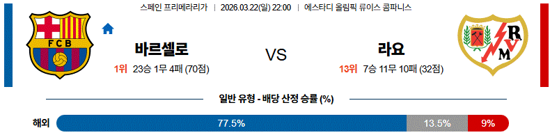 상대 전적에서도 바르셀로가 크게 앞서며 평균 득점에서도 우위를 보이고 있습니다. 경기 흐름은 바르셀로가 점유율을 바탕으로 일방적인 공격 전개를 펼치고, 라요는 수비적으로 버티며 제한적인 역습을 시도하는 구조가 예상됩니다.