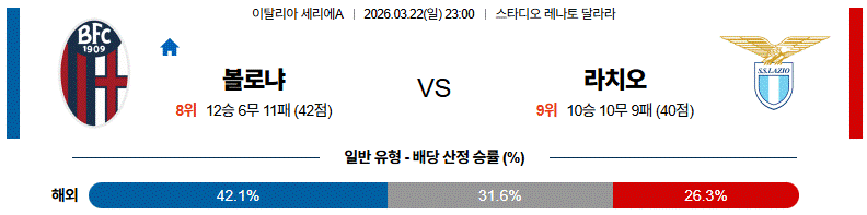 볼로냐는 홈에서 적극적인 압박으로 흐름을 가져오려 할 것이며, 라치오는 중원에서 점유율을 확보하며 경기를 풀어가려 할 것입니다.