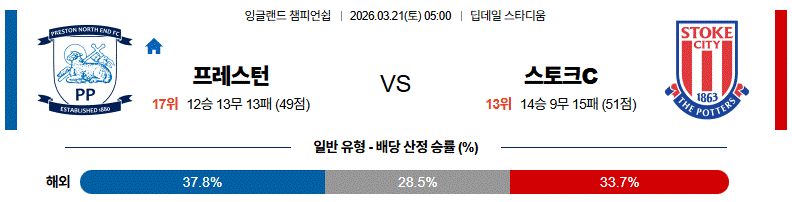 결국 이 경기는 스토크시티가 공을 소유하는 것처럼 보여도, 실제로는 프레스턴이 압박의 방향을 설계하며 상대 실수를 기다리는 구도로 흘러갈 가능성이 있다.