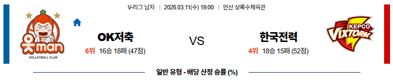 OK저축은행은 직전 KB손해보험전 패배로 흐름이 끊겼고 포스트시즌 경쟁에서도 승점 차가 벌어지며 동기부여가 다소 떨어진 상황이다. 차지환과 디미트로프의 공격이 있었지만 세트 후반 범실 관리에서 아쉬움이 나타났고 경기 마무리 집중력이 부족했다. 다만, 올시즌 홈에서 강한 모습을 보였고 상대전에서도 홈에서 좋은 흐름을 보여 쉽게 무너지지 않는 모습이다. 반면, 한국전력은 직전 삼성화재전에서 완승을 거두며 최근 상승 흐름을 이어가고 있다. 베논과 무사웰의 공격력이 안정적이고 신영석의 블로킹과 하승우 세터의 경기 운영도 안정된 모습이다. 접전 가능성 속에 한국전력 승리가 예상된다.