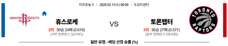 다음날 원정에서 덴버를 만나는 휴스턴과 다음날 원정에서 뉴올리언스를 만나는 일정을 위해서 힘을 분산해야 하는 토론토의 만남 이다. 휴스턴 로키츠는 직전경기 샌안토니오 원정에서 패배를 기록했지만 이전 포틀랜드전 승리를 포함해 최근 일정에서 경쟁력을 유지하고 있다. 케빈 듀란트와 아멘 톰슨이 공격에서 중심 역할을 맡고 있고 홈에서는 강한 경기력을 보여주고 있다. 직전 경기에서는 수비가 흔들리며 많은 실점을 허용했지만 홈 경기에서는 수비 집중력이 비교적 안정적인 모습이다. 반면, 토론토 랩터스는 RJ 배럿과 스코티 반스가 공격을 이끌고 있지만 일정 부담과 체력 변수도 고려해야 하는 상황이다. 휴스턴 로키츠의 승리가 예상된다.