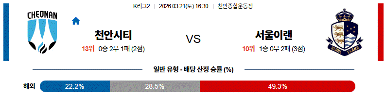 결국 이 경기는 서울이랜드가 더 많은 슈팅 찬스를 만들고, 천안은 버티는 시간 자체가 길어지면서 경기 전체 흐름이 원치 않는 방향으로 흘러갈 공산이 크다.