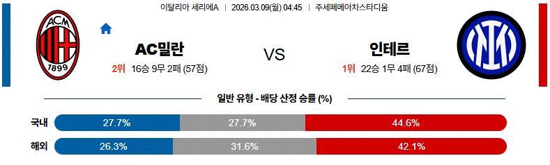 전술 구조와 전환 속도, 패스 네트워크의 완성도까지 모두 고려했을 때, 이번 밀라노더비는 인터밀란 승리 방향으로 접근하는 시나리오가 보다 설득력 있는 선택이라고 판단된다.