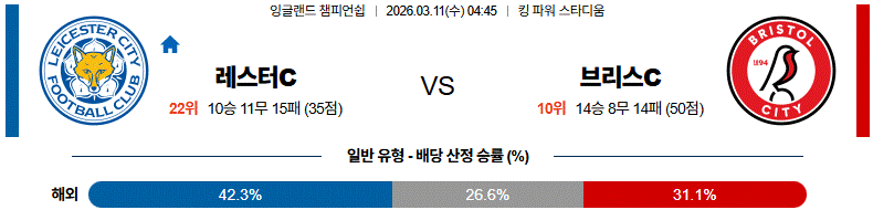 두 팀의 최근 맞대결에서도 접전이 이어졌으며 득점이 서로 오가는 경기가 많았습니다. 전체적인 전력과 홈 경기 이점을 고려하면 레스터 시티가 조금 더 유리한 흐름을 가져갈 가능성이 있습니다.