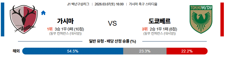 반면 도쿄베르디는 원정에서 조직과 집중력이 동시에 흔들리는 흐름이라, 이번 경기는 가시마 승리 쪽으로 해석하는 것이 보다 자연스러운 선택이다.
