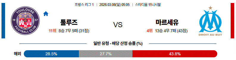 경기 흐름은 툴루즈가 압박과 빠른 전환으로 대응하고 마르세유가 점유율을 통해 경기를 운영하는 양상이 예상됩니다.