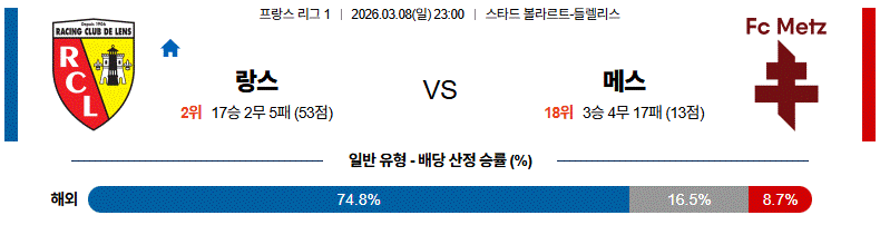 경기 흐름은 랑스가 점유율과 압박을 통해 공격을 이어가고 메스가 수비적으로 대응하는 형태가 예상됩니다.