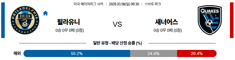 전술 구조와 빌드업 안정성, 그리고 심리적인 자신감까지 감안하면, 이번 경기는 필라델피아가 경기 주도권을 쥐고 득점 기회를 더 많이 만들며 결과까지 가져갈 확률이 높다고 판단된다.