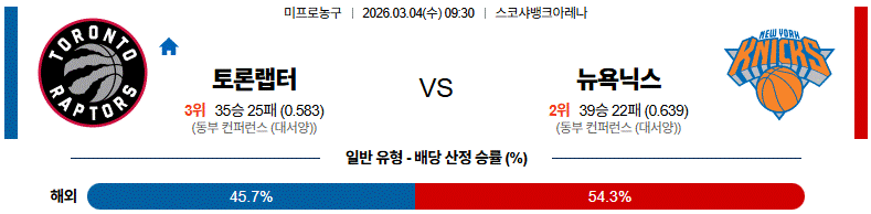 강력한 윙 수비진과 브런슨의 안정적인 리딩을 앞세운 뉴욕이 토론토의 단순한 공격 패턴을 제압하며 승리를 가져갈 것입니다.