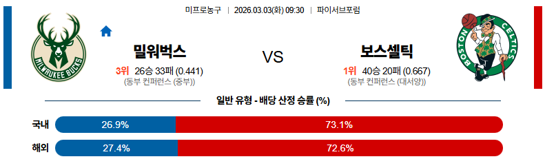 밀워키는 야니스 아데토쿤보의 공백이 크다. 보스턴이 높이 싸움과 베스트5 생산력에서 우위에 있다. 보스턴 승리가 예상된다.