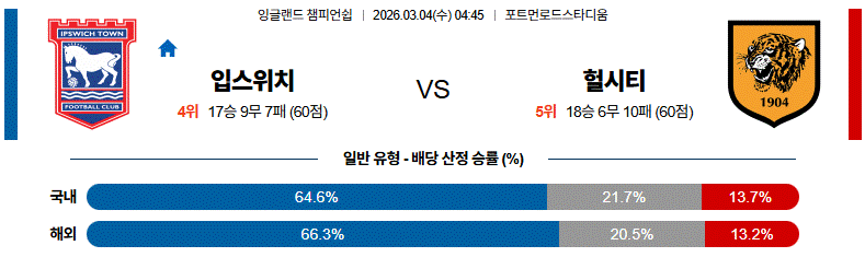 이번 경기는 입스위치의 침투 자원들이 헐시티 수비의 구조적 허점을 그대로 활용할 수 있는 구도인 만큼, 입스위치 승리 쪽 기대값이 더 크다고 보는 편이 합리적이다.