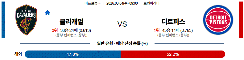 클리블랜드는 제임스 하든이 복귀하며 한숨 돌렸으나 에이스 도노반 미첼의 결장이 뼈아픈 상태이며, 디트로이트는 케이드 커닝햄을 필두로 공수에서 압도적인 밸런스를 자랑하며 컨퍼런스 선두를 질주 중입니다.