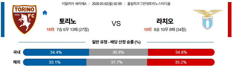 전체적으로는 라치오가 원정에서도 주도권을 유지하며 경기를 풀어갈 전망입니다.