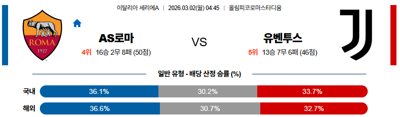 최종 추천: AS로마 무승부/승 + 언더