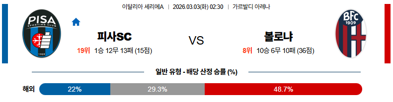 전체적으로는 피사SC의 크로스·세트피스와 볼로냐의 전환 공격이 맞물리며, 득점 기회가 많은 난타전보다는 신중한 전개가 유력합니다.