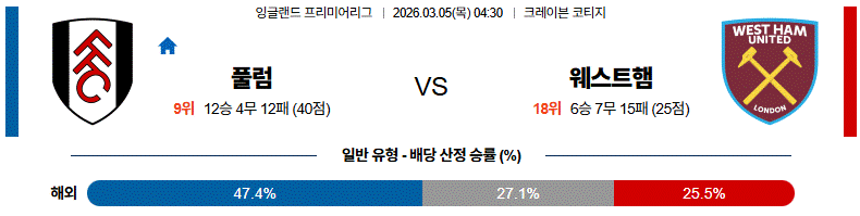 핵심 포인트는 풀럼의 점유율 우위가 웨스트햄의 역습 전환 상황을 얼마나 차단하느냐입니다.