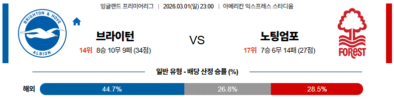 브라이튼은 루터·미토마·고메즈를 중심으로 노팅엄의 높은 수비 라인 뒤를 노리는 직선적인 공격 패턴을 준비할 수 있는 팀이고, 라인브레이킹이 가능한 자원이 앞선에 포진해 있다는 점에서 상대 약점을 정확히 찌를 수 있는 조건을 갖추고 있다.