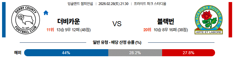 결국 전체적인 전술 구조와 중원 안정감을 놓고 보면, 이번 매치업은 더비카운티가 클라크를 축으로 한 공격 패턴을 통해 블랙번의 약점을 정확히 찌르며 득점 기회를 더 많이 만들어 낼 수 있는 구도라고 보는 편이 타당하다.