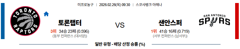 일정 상의 우위와 웸반야마를 필두로 한 강력한 주전 라인업을 앞세운 샌안토니오가 체력이 소진된 토론토를 꺾고 승리할 것입니다.