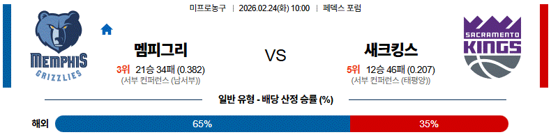 멤피스는 주전 부상 공백 속에서도 젊은 자원들의 활약으로 공격 흐름을 유지하고 있으며 최근 홈에서는 연승을 기록하며 경기 집중력이 살아난 모습이다. 지지 잭슨과 제일런 웰스가 득점에서 중심 역할을 하고 있고 스카티 피펜 주니어와 타이 제롬도 공격에서 지원하며 경기 운영 안정감이 개선되고 있다. 상대적으로 수비 기복은 존재하지만 최근 맞대결에서도 승리를 기록하며 상성 우위를 보였다. 반면, 새크라멘토는 16연패 흐름 속에 수비 조직력이 크게 무너졌고 외곽 수비와 리바운드 경쟁에서 약점을 노출하고 있다. 핵심 자원들의 시즌 아웃 공백이 크고 원정 16패 흐름으로 경기력 반등 가능성이 낮다. 멤피스의 승리가 예상된다.