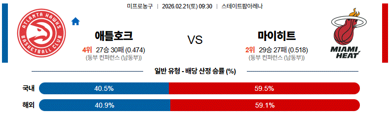 애틀란타는 연속경기 일정이다. 애틀란타는 직전경기(2/20) 원정에서 필라델피아 상대로 117-107 승리를 기록했으며 이전경기(2/12) 원정에서 샬럿 상대로 107-110 패배를 기록했다. 3연패에서 벗어나는 승리가 나왔으며 리바운드 50-46, 3점슛 10-11, 턴오버 13-16의 결과. 제일런 존슨(32득점)이 공격과 리바운드에서 중심 역할을 했고 CJ 맥컬럼(23득점)도 외곽과 중거리에서 득점을 올리며 지원했던 경기. 다이슨 대니얼스(15득점), 니케일 알렉산더 워커(14득점)도 안정적인 득점으로 팀 공격 균형을 만들었으며 자카리 리사셰르(10득점)와 조크 랜데일(10득점)까지 고른 득점이 이어졌던 상황.정규시즌 홈경기에서는 10승15패 성적.