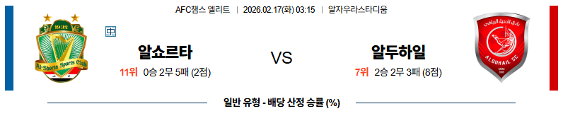 알쇼르타는 수비 중심의 운영으로 실점을 억제하며 역습 기회를 노릴 전망입니다.