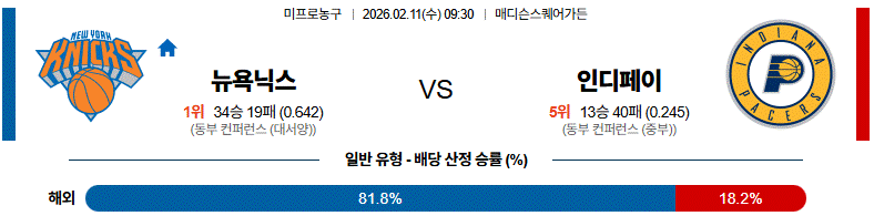 인디애나의 붕괴된 골밑을 칼-앤서니 타운스가 지배하고, 브런슨의 화력과 탄탄한 벤치 뎁스가 조화를 이룬 뉴욕 닉스가 완승을 거둘 것입니다.