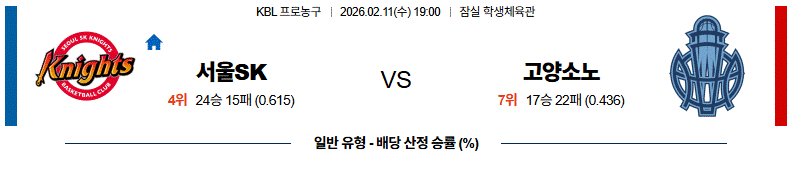 서울 SK는 최근 2연승으로 흐름은 유지하고 있지만 김낙현과 안영준 이탈 공백이 여전히 공격 전개와 수비 로테이션에서 부담으로 작용하고 있다. 워니와 톨렌티노 중심의 득점 의존도가 높아 경기 후반으로 갈수록 선택지가 제한되는 모습이다. 반면, 고양 소노는 3연승과 함께 이정현, 네이던 나이트, 케빈 켐바오의 삼각 공격이 안정적으로 가동되고 있고 이재도 복귀와 모츠카비추스 합류로 로테이션 깊이도 개선됐다. 고양 소노 승리가 유력하다.