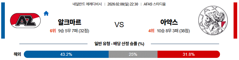 알크마르는 홈에서 압박과 템포로 밀어붙이겠지만, 아약스의 점유율 전개와 중앙 연계도 충분히 위협적입니다.