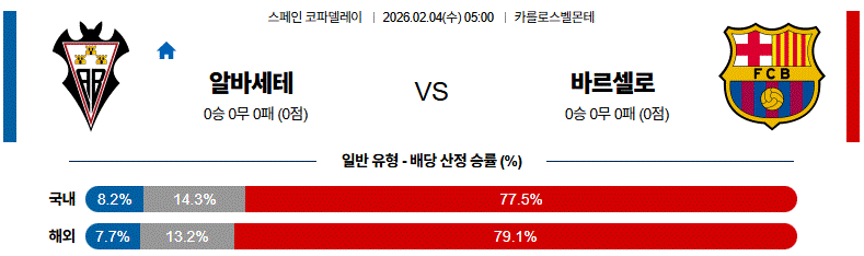 알바세테가 수비적으로 저항하겠지만, 전력과 공격 완성도에서는 바르셀로나가 확실히 앞서는 경기입니다.