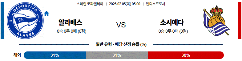 알라베스가 홈에서 수비적으로 버티겠지만, 중원 장악과 전개 완성도에서는 소시에다드가 앞서는 매치업입니다.