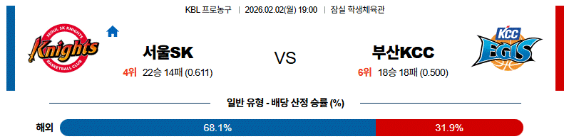 부산 KCC가 골밑에서 맞설 수 있지만, 전체적인 기동력과 수비 압박에서는 서울 SK가 앞서는 경기입니다.