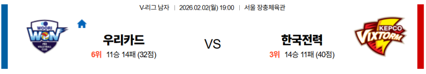 우리카드는 리턴매치였던 직전경기(1/30) 홈에서 삼성화재 상대로 3-1(32:30,21:25,25:18,25:16) 승리를 기록했으며 이전경기(1/22) 원정에서 삼성화재 상대로 3-0(25:20,25:23,25:17) 승리를 기록했다. 2연승 흐름 속에 블로킹 14-5, 서브 6-3, 범실 22-30의 결과. 에이스가 되는 아라우조(33득점)가 공격 전반을 이끌며 결정적인 순간마다 득점을 책임졌고, 알리(11득점)와 이상현(10득점-블로킬 6개)도 두 자릿수 득점으로 힘을 보탰던 경기. 1세트에서는 19-24로 뒤진 상황에서도 이시몬, 이승원, 한성정 투입 이후 분위기를 반전시켰고, 듀스 접전 끝에 아라우조의 연속 백어택으로 세트를 가져온 것이 기세 싸움에서 결정적인 역할을 해냈던 상황. 또한, 구단주의 현장 방문이 선수단 집중력과 사기 진작에 큰 힘이 되었던 모습. 정규시즌 홈경기에서는 4승8패 성적.