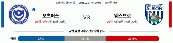 포츠머스가 초반부터 라인 간격을 촘촘히 유지하며 실점을 막아낸다면 변수는 있겠지만, 전체적인 수비 안정감과 공격 완성도를 고려하면 웨스트브로미치 승리 쪽에 무게를 두는 것이 자연스러운 선택이다.