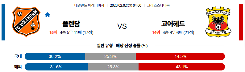 이 경기는 폴렌담이 홈에서 의외의 저항을 보여줄 여지가 전혀 없는 것은 아니지만, 전술적인 상성과 공간 활용 능력을 고려하면 고 어헤드 이글스 쪽으로 결과가 기울 가능성을 더 높게 볼 수 있는 매치업이다.