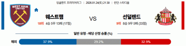 웨스트햄은 홈의 열기와 강등 위기라는 압박을 에너지로 바꿔, 전방 압박과 박스 안 싸움에서 선더랜드를 몰아붙일 가능성이 크다.