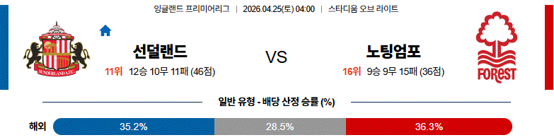 선덜랜드 vs 노팅엄 포레스트 경기는 홈팀이 초반 에너지로 맞서겠지만, 경기 운영의 안정감과 공간 활용에서 원정팀이 조금 더 우세할 가능성이 높은 매치업입니다.