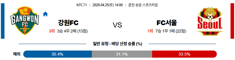 강원은 전환 한 방의 날카로움은 갖고 있지만, 이번 경기는 서울이 초반부터 높은 압박 라인으로 전개 출발점을 끊어 먹을 가능성이 크다.