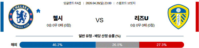 리즈도 득점 가능성을 완전히 버릴 필요는 없지만, 경기 흐름이 길어질수록 찬스의 질과 공격 효율에서 첼시 쪽 우위가 드러날 가능성이 큽니다.