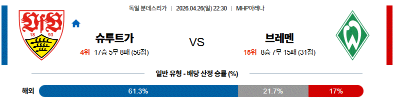 브레멘이 역습으로 변수는 만들 수 있겠지만, 슈투트가는 홈에서 공격 전개 완성도와 찬스 생산력이 훨씬 안정적인 팀입니다.